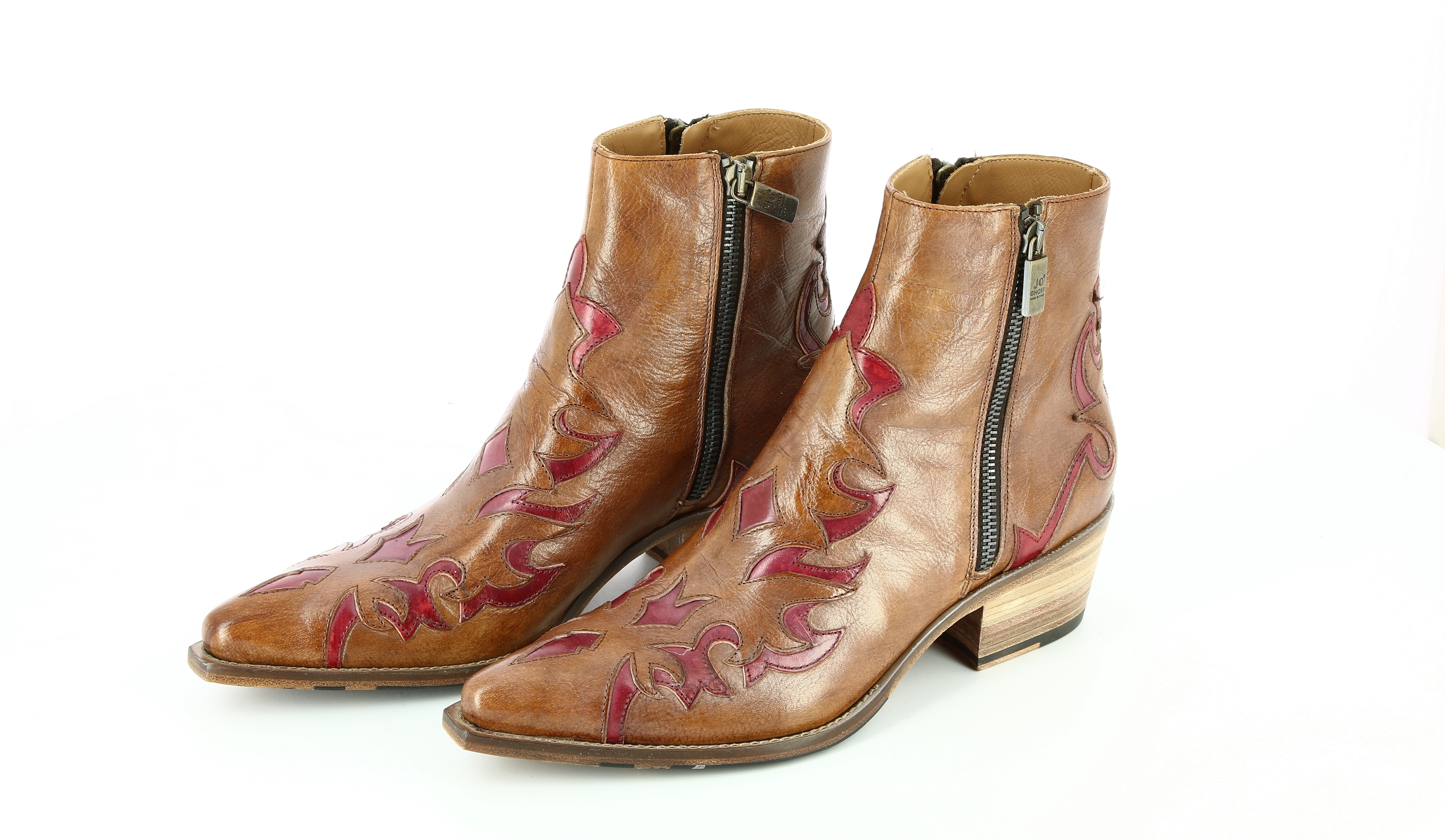 Wieder eine außergewöhnliche Kreation aus dem Hause Jo Ghost. Dort versteht man es wirklich, Schuhe als kleine Kunstwerke zu designen.  Hier ein leicht schattiertes Naturbraun mit zartroten Flammen-Aplikationen.  Einfach perfekt !! Besonders  gelungen ist auch die Fersengestaltung.  Ihr müsst Euch das in unserem Webshop mit dem ZOOM anschauen. Natürlich haben diese Boots eine hervorragende Passform und vermitteln sofort ein sehr angenehmes Tragegefühl.  Komplett mit Lederfutter ausgestattet auf dem 4 cm-Absatz ist er ein  RundumdieUhr-Schuh !! Und mit der durchgenähten Sohlenkonstruktion hält er viele Jahre.  Diese Boots fallen grosszügig aus.
